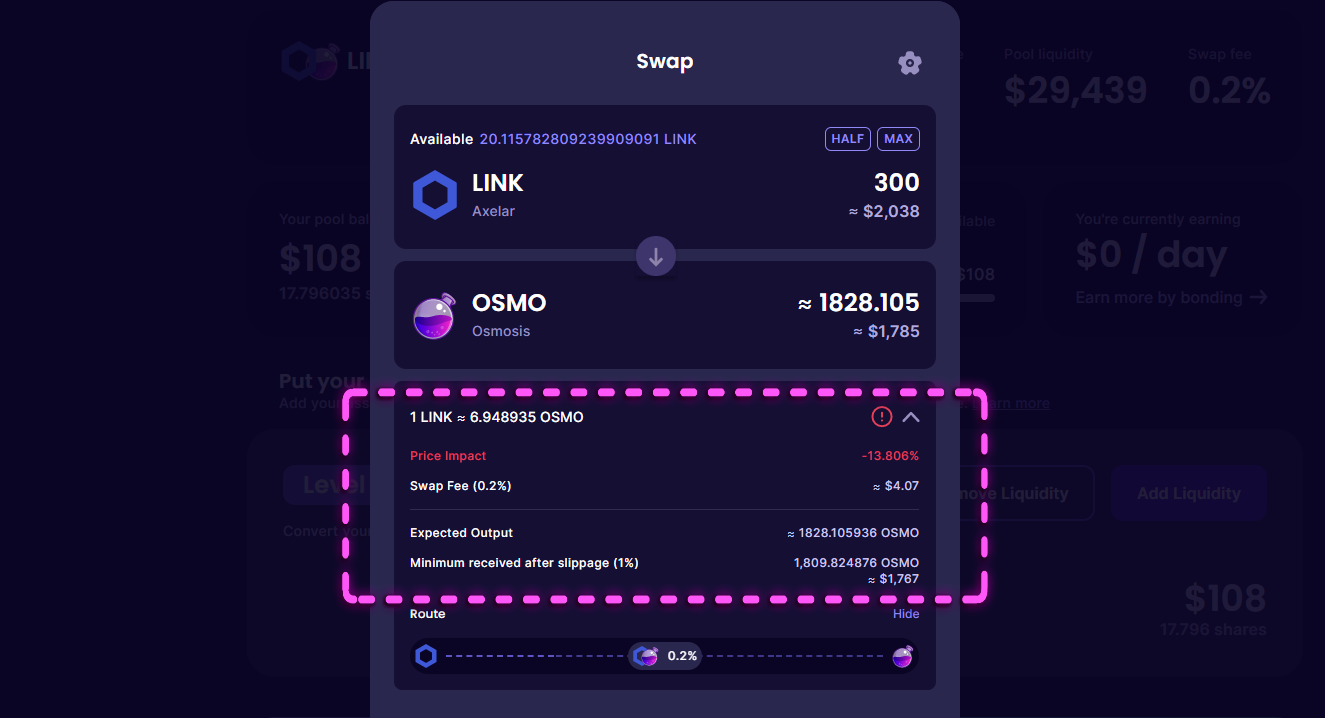 You can change the slippage settings by clicking on the cog icon on the top right of the swap card. If we change it to 5%, the minimum received before rejecting the trade reduces to 128.77 OSMO. However, the price impact in the pool stays the same.
